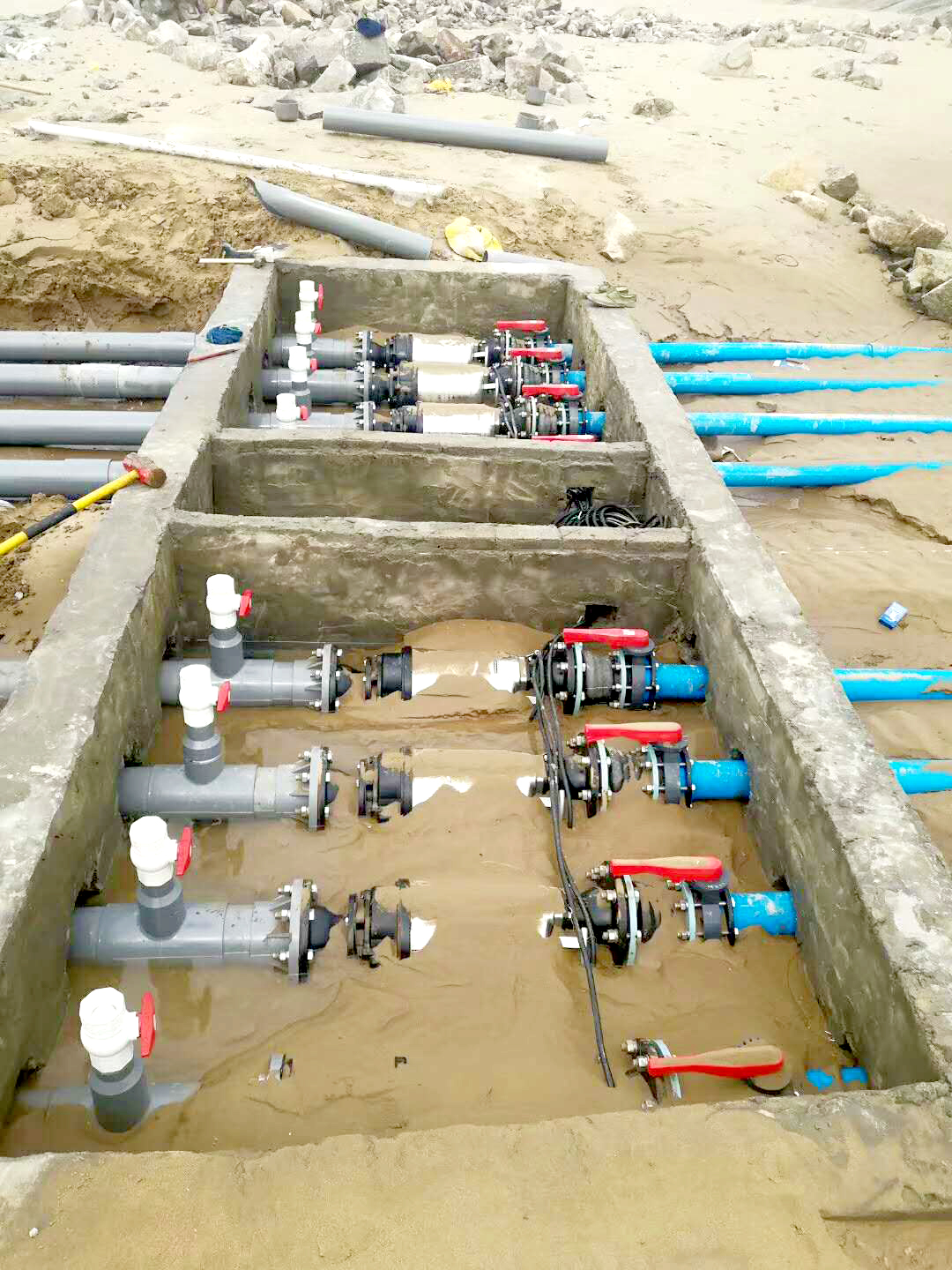 The customer pumping seawater into the artificial landscape pool in the hotel. It requires long time running. There are total 8 units of 10HP with 6 inch outlet IC Submersible Dewatering Pumps (IC-610) were installed. IC series pump is equipped with water-cooled motor to ensure a longer life in continuous and intermittent operation also able to cover by sea sand, able to reduce the noise effectively. The hardness of chrome steel impeller can reach 25~ 30 Rockwell scale which is better anti-corrosion of seawater and abrasion of sea sand.